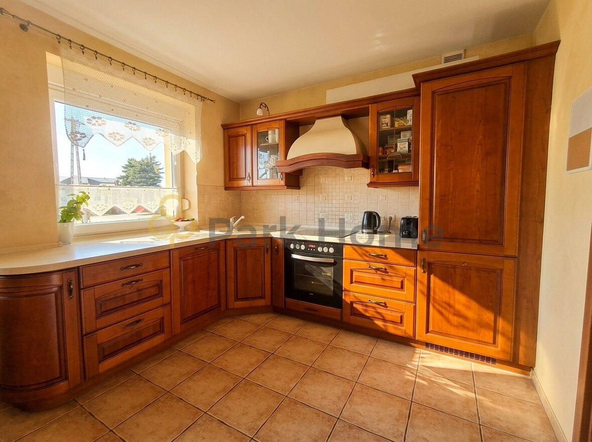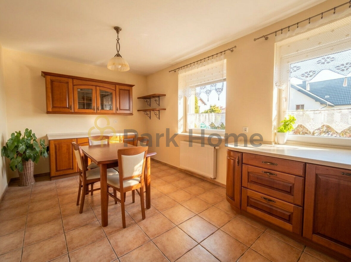 Kuchnia jest jasna, dobrze doświetlona i wyposażona w duży blat roboczy, który ułatwia codzienne gotowanie. Miejsce na stół tworzy przytulną przestrzeń na rodzinne posiłki.